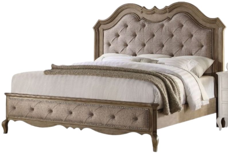 Features: Padded headboard/footboard (beige fabric, button tufted, nailhead trim), raised molding trim, wooden cabriole leg