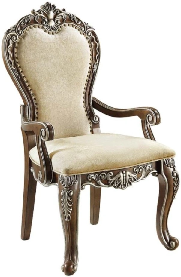 The Latisha arm chairs bring comfort and elegant traditional style into your dining room. With plush seat cushions and padded backrests, dinner parties will surely last for hours. Against the antique oak, the floral moldings are highlighted with silver hand-brushed detailing on the legs and apron.Read More