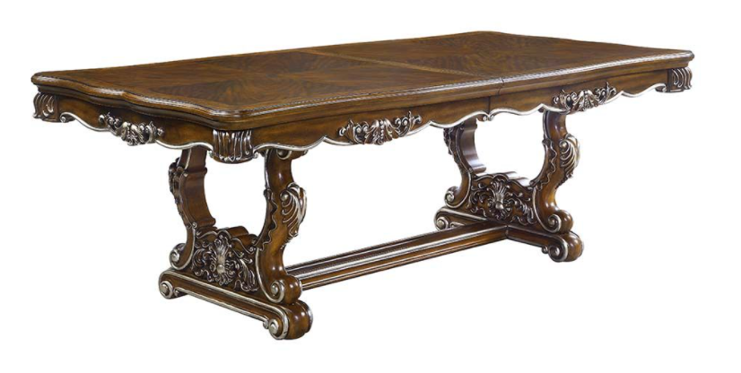Traditional design with modern accents, the Latisha pedestal dining table is the perfect merging of contemporary and classic. The antique oak finish with the hand-brushed silver trim accentuates the elaborate floral moldings that are showcased throughout the trestle pedestal base and apron.Read More