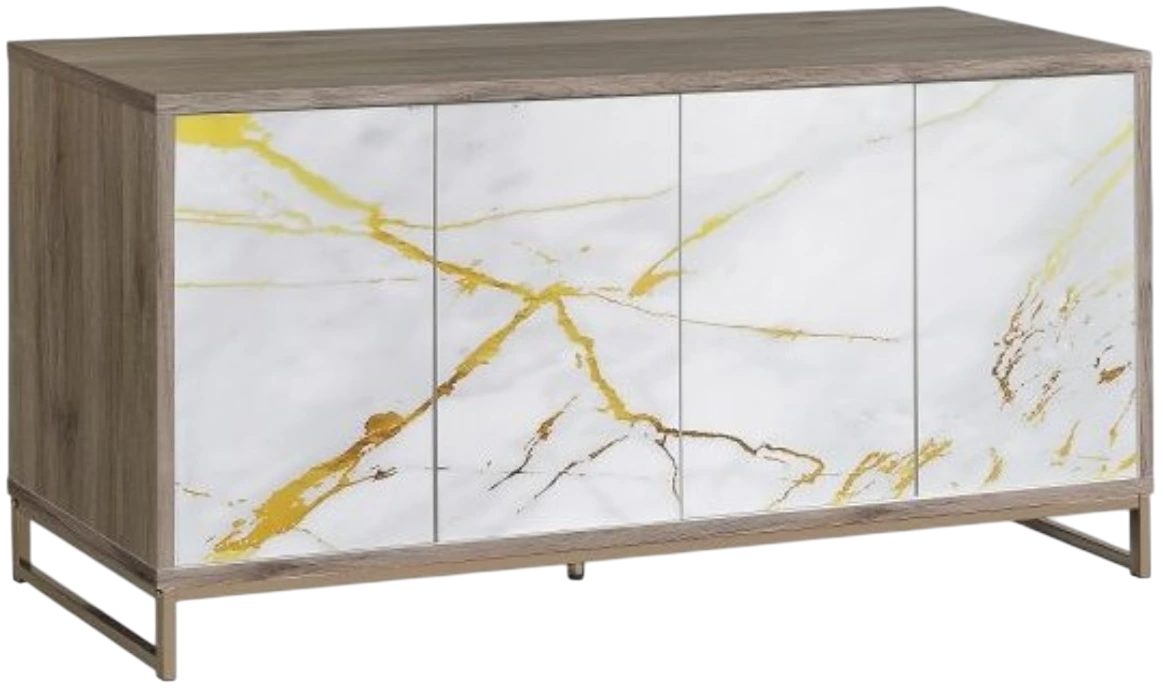 Make your home a mecca for modern luxury with this Paavan console cabinet. White finishes paired with faux marbled door fronts and oak finish outer frame to create this luxe piece. The champagne base is the perfect finishing touch that adds fashionable stability.Read More