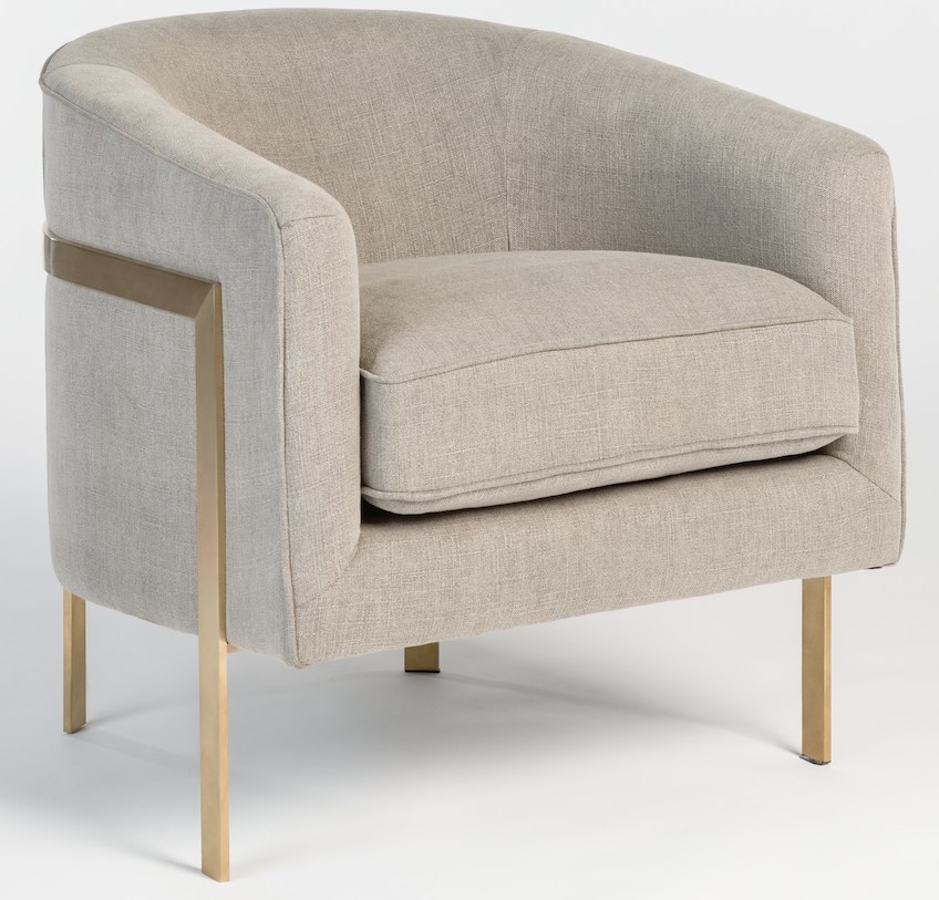Encircling the oh-so-comfortable-looking Collins Occasional Chair, upholstered in White Husk fabric, is the metal base, finished in Soft Gold. The result is an elegantly beautiful chair that will enhance any room.