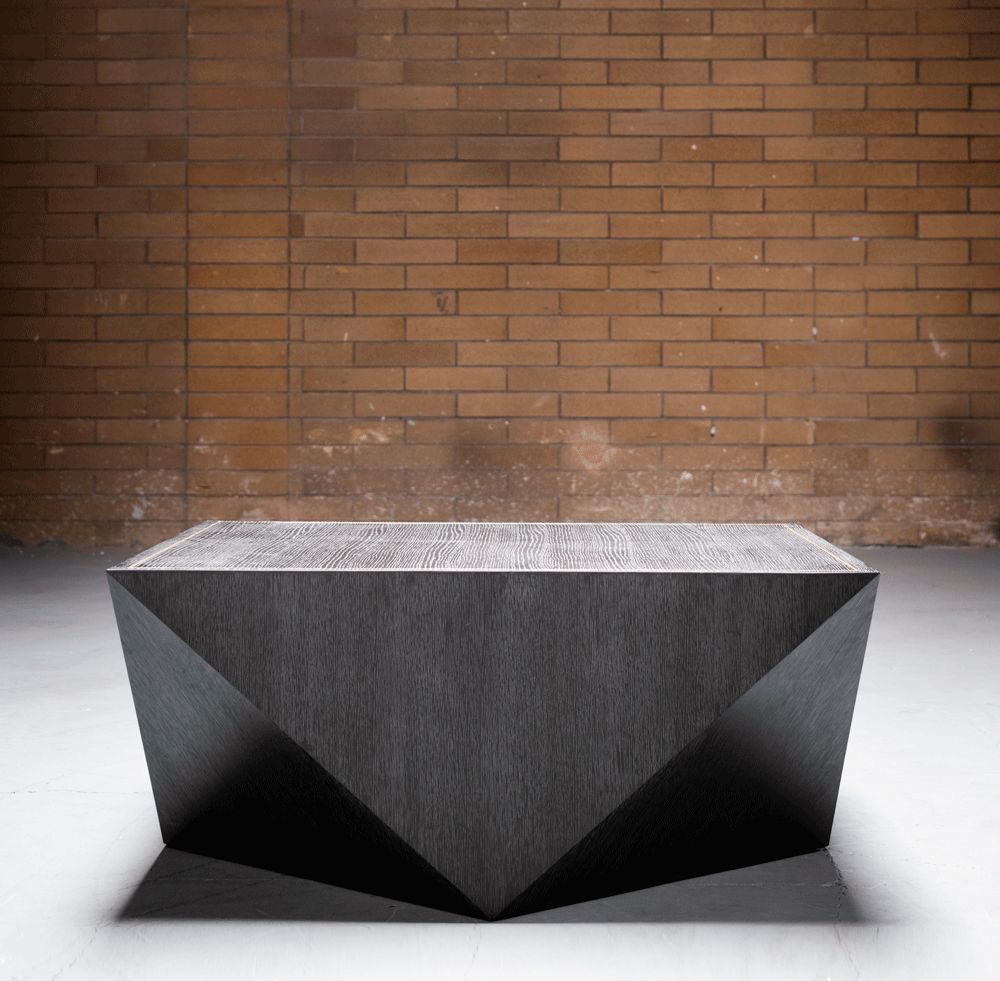 The Gavin Brushed Carbon Coffee Table offers Aged Bronze metal accent with a geometric base. The table is made of metal and oak veneer.