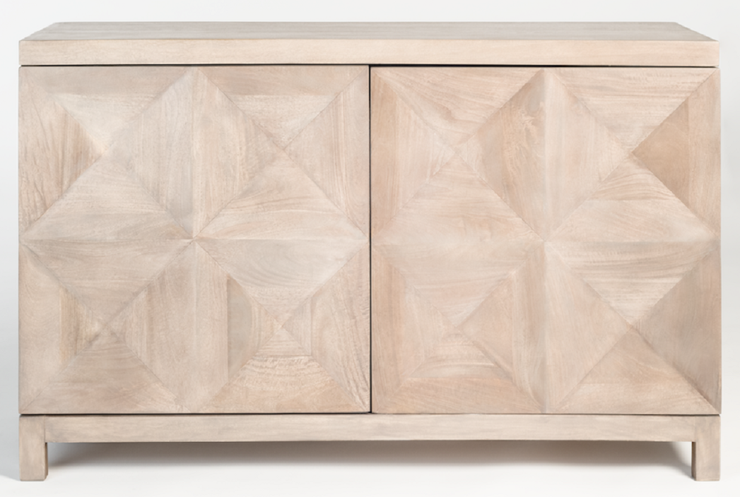 Decker Sideboard made with mango wood with 4 door in misted ash finish and geometry pattern design.
