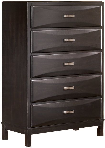 Turn to the Kira 5-drawer chest when you need more stylish storage space in your contemporary bedroom. With large spacious drawers featuring sharp and bold edges brought out by the sculpted overlay drawer fronts, there’s plenty of room to tuck away all your favorite apparel. Relish the sheened finish and aged bronze-tone drawer pulls that highlight your room’s tasteful contemporary style. Give your room extra storage and vivid character with this 5-drawer chest from Ashley®.