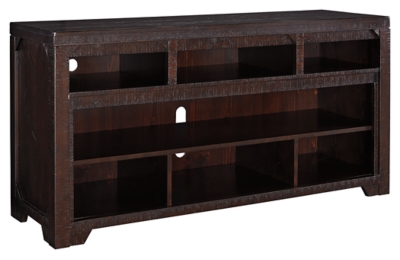 Introduce a natural, exotic look to your island of entertainment. Made of pine wood with a heavily distressed dark brown finish, this TV stand offers open media storage with a plank style top to rest your TV. The lower divided removable cubby can be replaced with an optional wide fireplace unit that includes a realistic flame effect with color change option, faux glass crystals and natural rock inserts—beautiful for creating a relaxed atmosphere.Read More