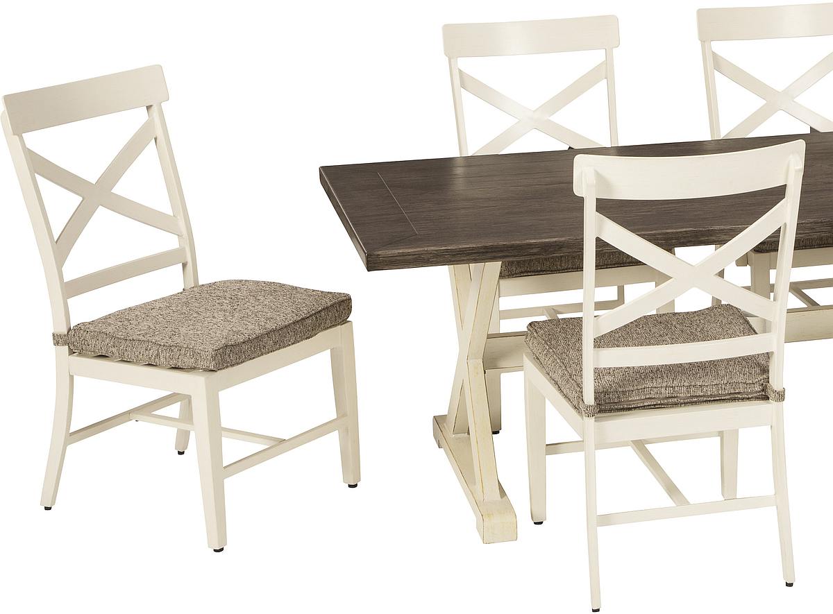 Bring the relaxed aesthetic of modern farmhouse design outdoors with this dining table set. The table is finished with a creamy white base and a wood-look top, and the table and chair's rust-proof aluminum frame ensures carefree living with an easy-breezy appeal. Comfy, casual and absolutely on trend, this set is perfect for use inside or out.