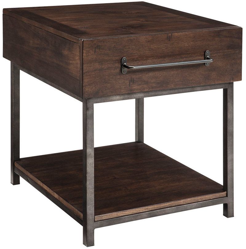 For fans of urban industrial design, the Starmore end table clearly steals the show. Tabletop is crafted of acacia veneer beautified with an oiled walnut-tone finish. Incorporation of sleek tubular metal frame and linear, large-scale pulls pull it all together.