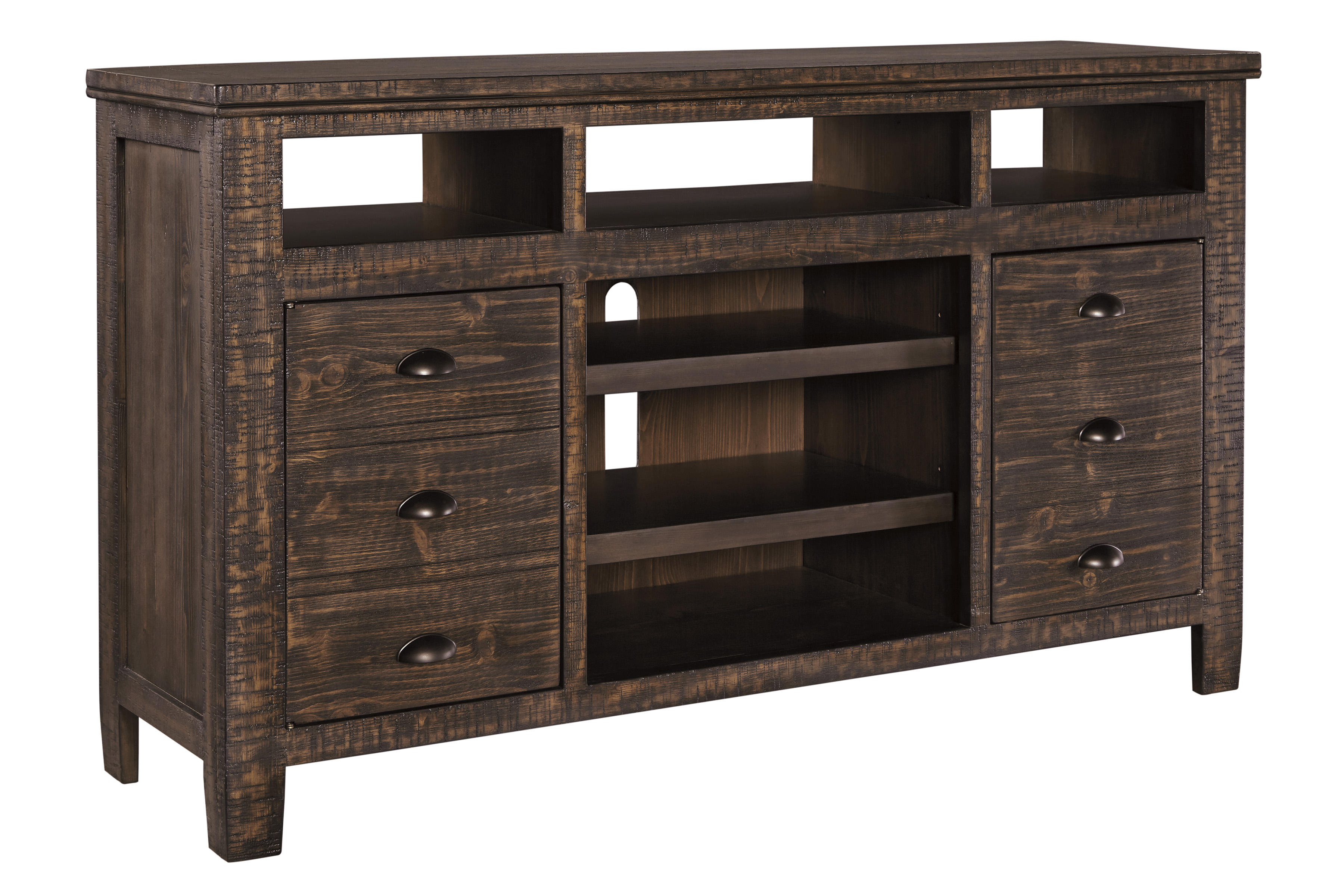 Crafted of 100% quality pine wood for years of satisfaction, this TV stand is beautifully in tune with an urban-rustic aesthetic. Distinctive finish with dramatic golden-brown contrasting and subtle wire brush distressing elevates the look from simple to simply extraordinary. Faux drawers (that are actually dual doors) with bin pulls infuse a charming apothecary touch. Opt for the optional LED fireplace insert for added warmth. Also compatible with our audio system insert. Both inserts sold separately.Read More