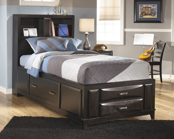 With a dark finish and exciting contemporary design, the beauty and refreshing style of the "Kira" youth bedroom collection creates the perfect atmosphere for the bedroom of your kid's dreams. The almost black finish flows dramatically over the slat style headboard and shaped overlay drawer fronts to enhance the straight lined contemporary design of this bedroom collection. With aged bronzed color hardware complementing the dark finish and a stylish beveled mirror, this furniture is sure to enhance the look of any home's decor. Sleep within the rich contemporary style and comfort of the "Kira" youth bedroom collection.