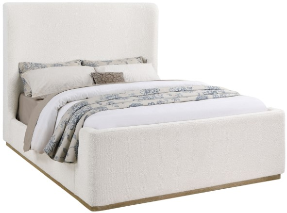 Upholstered platform bed wrapped in soft and textured cream boucle fabric