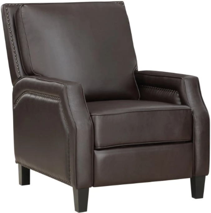 With a reclining mechanism that is engaged with your push, settling into the Berenson Collection is done with ease. The tailored profile of the push back reclining chair is covered in dark brown faux leather and features nail head trim, lending to its transitional style, creating the perfect complement to your home’s décor.Read More