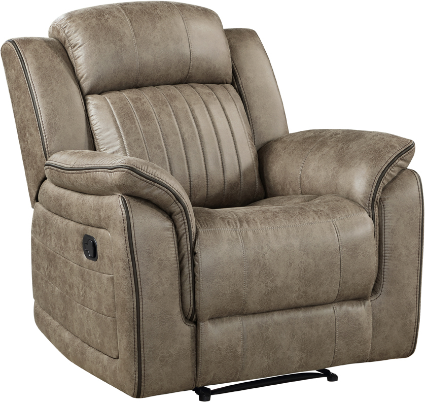 Plush seating features vertical tufting, pillow-top arms, enhanced by the reclining mechanism which is engaged with a pull of the side mounted tab, taking you from seated to prone in an easy motion.