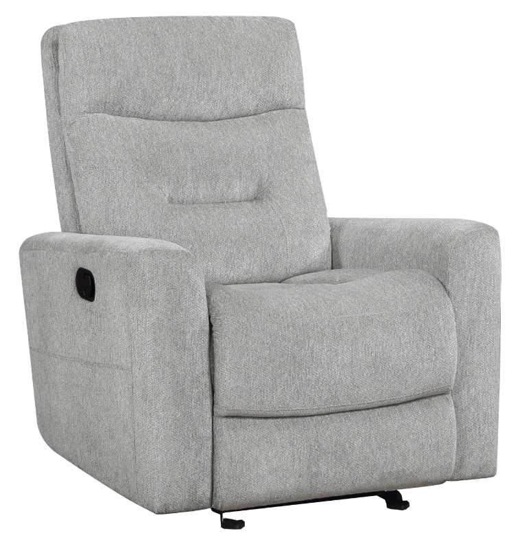 Your comfort is at hand in the design of the Lyndon Collection. The single reclining mechanism of the glider chair is engaged with a pull of the side-mounted tab. Gray chenille fabric upholstery covers the plush, subtle modern framing, furthering your comfort, and serving as a neutral palette for your living room décor.Read More