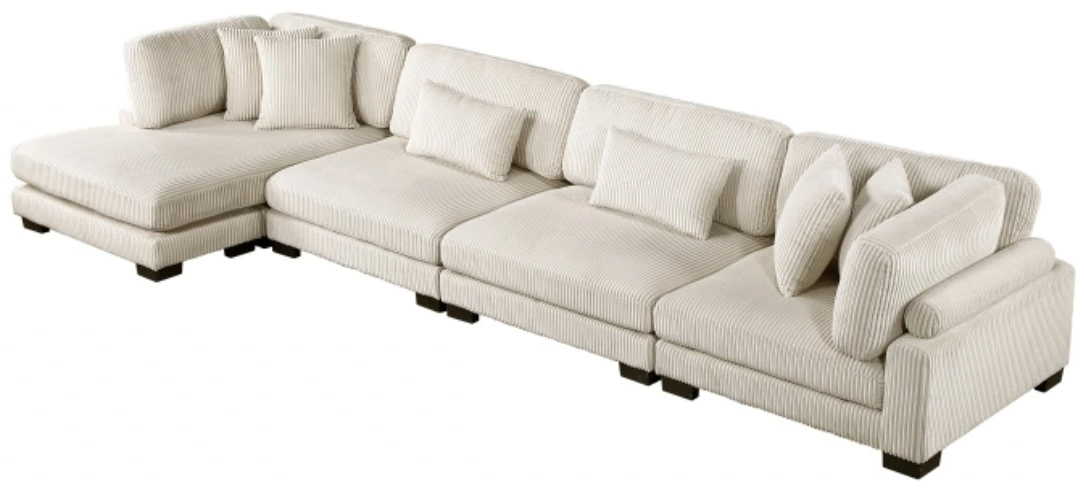 Configurable to your available space, the Traverse Collection allows for the addition and detachment of pieces for a customized seating experience. The 4-piece sectional configuration consists of one corner unit paired with two armless chairs, and a chaise. The beige corduroy fabric upholstery creates a plush expanse for a soft touch experience.Read More