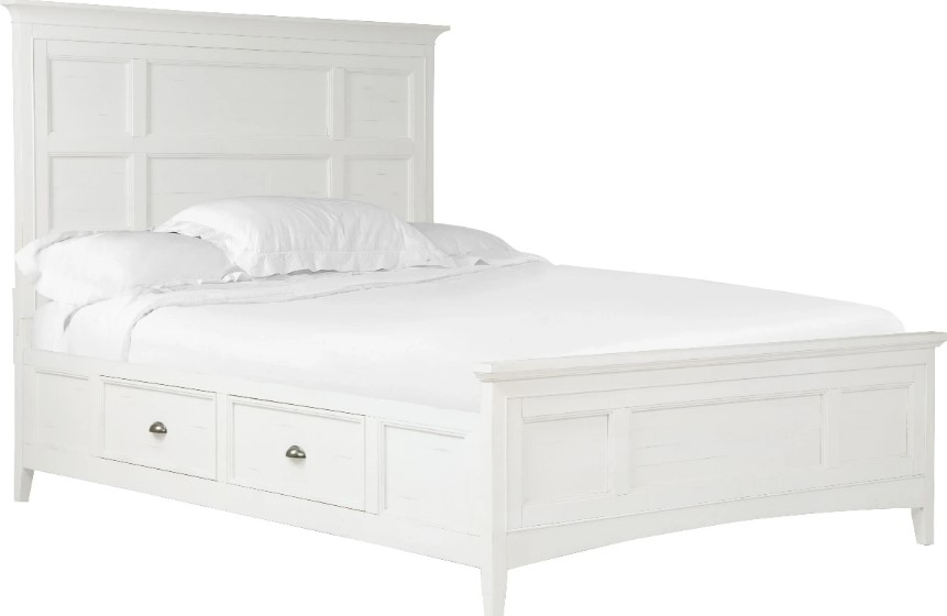 A soft chalk white finish on pine veneers and solids creates a relaxed beachy feel in any bedroom with Heron Cove. Select pieces offer a two-tone look with dovetail grey tops. A high back beaded framed panel bed lends shaker appeal and is available with hidden rails storage.Read More