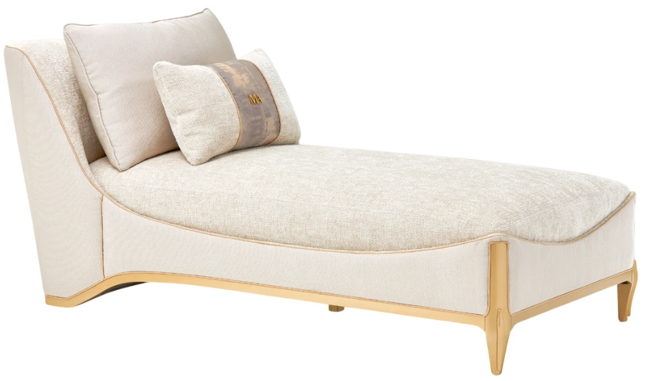 The La Terrazza cappuccino/light champagne chaise adorned with a jacquard woven fabric back, piping traces the chaise's fluid lines, while tapered legs finished in champagne imbue it with an air of effortless grace. Accompanied by plush accent pillows, this chaise transforms any space into a haven of tranquility.Read More