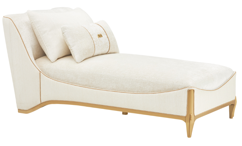 The La Terrazza light champagne/starlight chaise features wrapped in a textured woven fabric exterior, piping accents trace the chaise's fluid lines, and tapered legs finished in lustrous champagne lend an air of weightless grace. Accompanied by two accent pillows, this chaise exemplifies modern luxury and artistic refinement.Read More