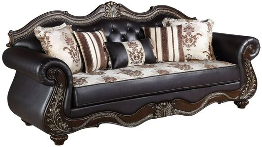 Luxurious Fabric Blend: A combination of rich brown vegan leather, paired with elegantly patterned and soft-textured accent pillows, creates a sophisticated, decorator-quality look. This premium fabric mix not only enhances the visual appeal but also provides a plush, inviting feel, making it the perfect centerpiece for any refined and stylish living space.