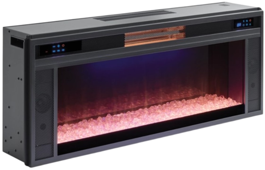 With the touch of a button, this fireplace insert gives you the cozy feel of a fireplace without the hassle, maintenance or cleanup. Available as an addition on select TV stands and entertainment centers, it includes multiple temperature settings, ambient lighting and built-in wireless speakers. The color-changing crystal flame bed operates with or without heat.Read More