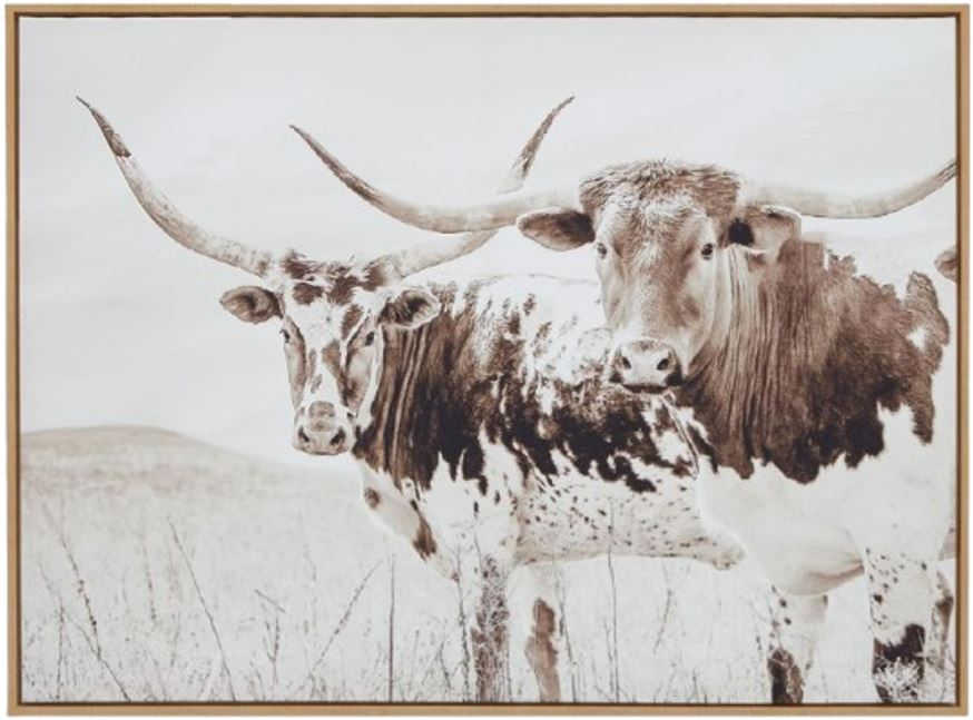 Create an idyllic feel in your interior with this wall art. A peaceful portrait of longhorn cows roaming the countryside, the sepia-toned piece has a vintage vibe well-suited to casual and farmhouse aesthetics.Read More