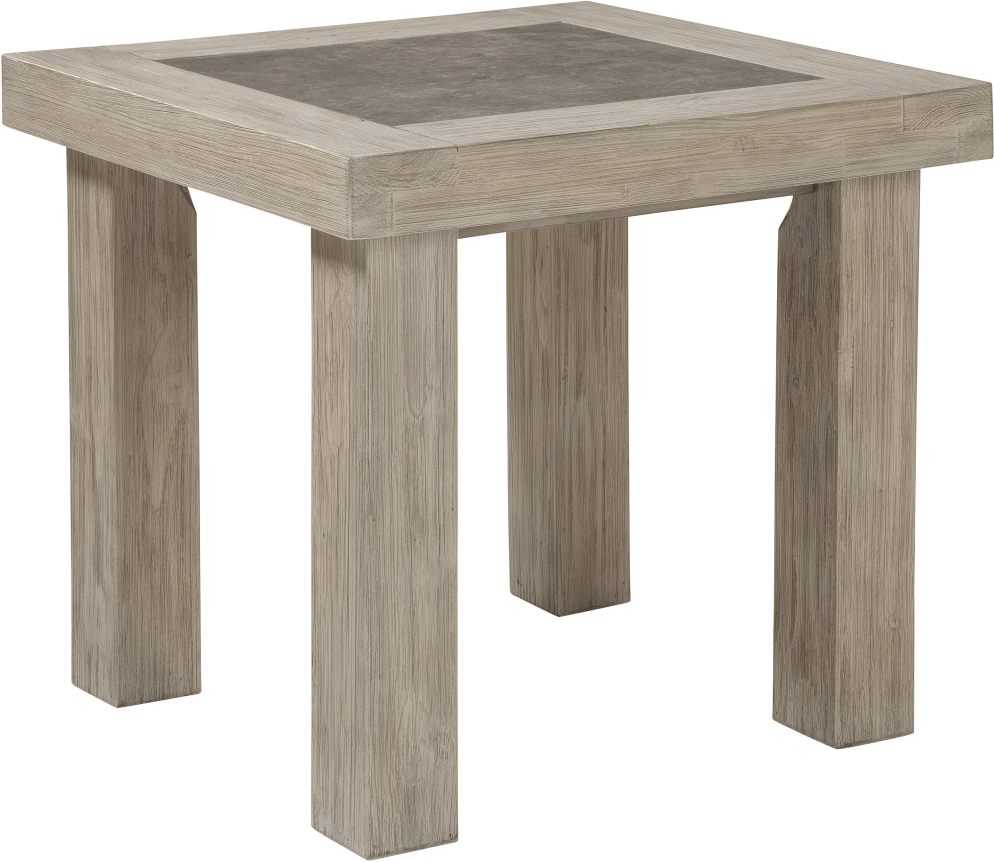 A striking example of rustic refinement, this end table is generously scaled to accommodate your entertainment needs with ease. Made with pine wood and veneer beautified with a complex bisque finish, this designer coffee table includes a top with melamine insert for mixed media interest.