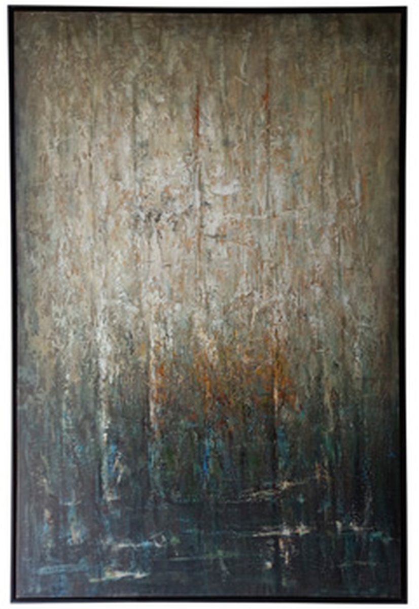 Abstract design in shades tan, teal, navy, gold and black. Framed gallery wrapped canvas. Hand painted. D-ring bracket for hanging. Vertical and horizontal hanging. Due to the hand crafted nature of this product, some variations may occur.Read More