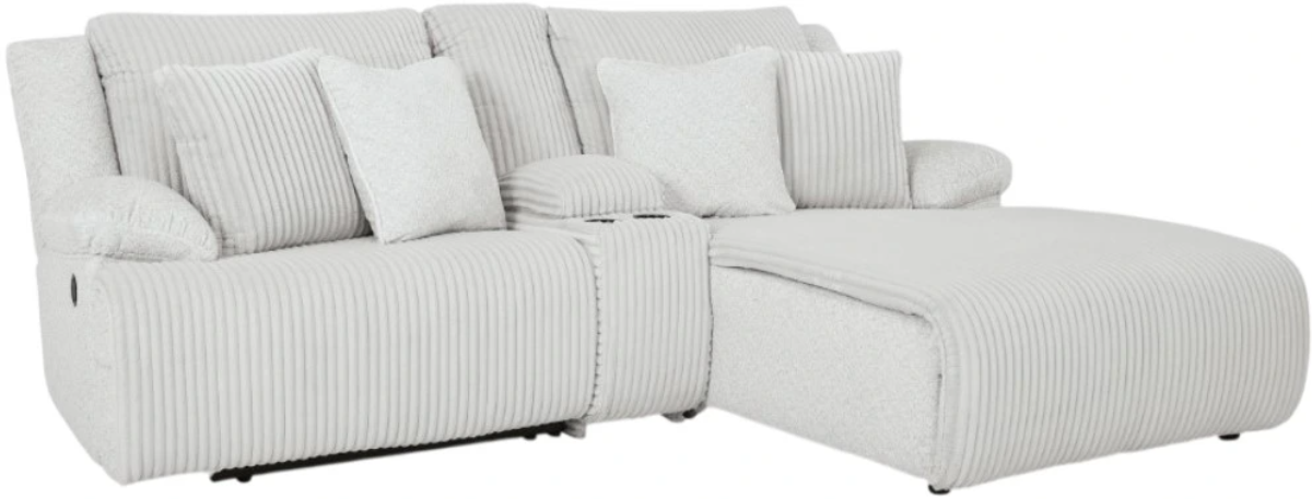 Includes left-arm facing recliner, console with storage and right-arm facing press-back chaise