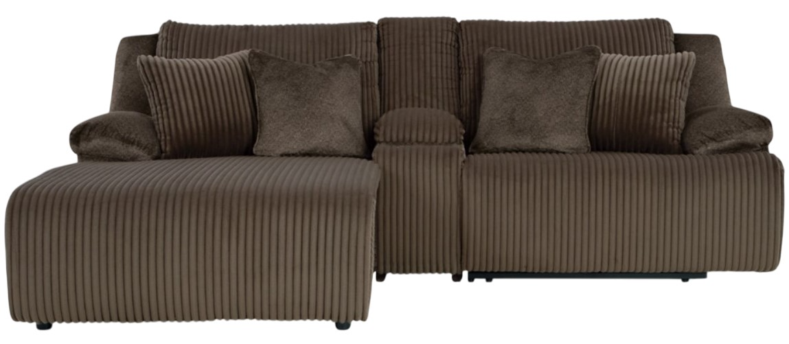 Includes 3 pieces: Left-arm facing press back chaise, console with storage and right-arm facing recliner