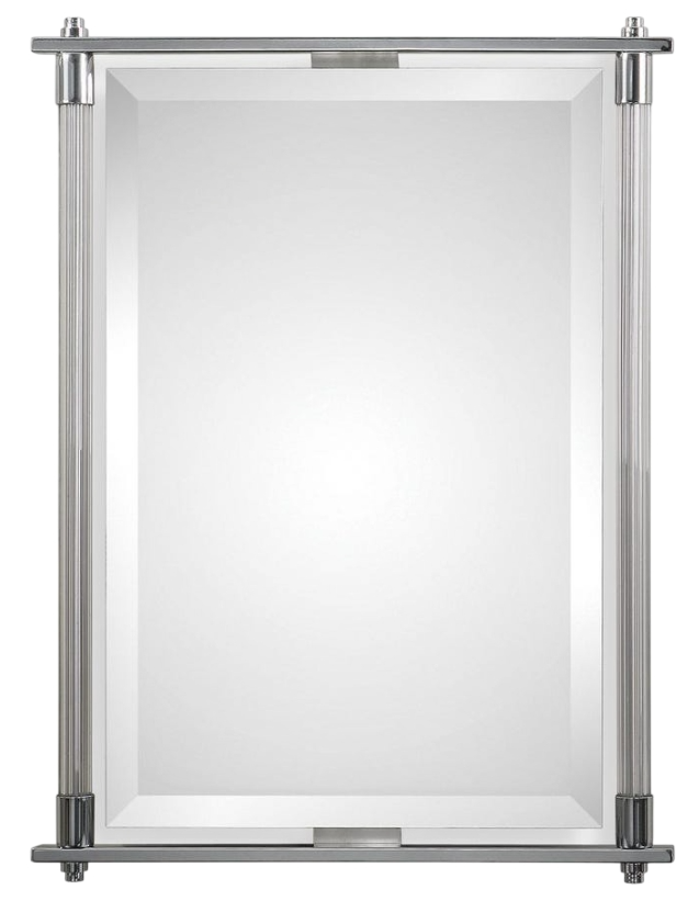 Ribbed glass columns accented with polished chrome plated details. Mirror features a generous 1 1/4" bevel and may be hung horizontal or vertical. Durable yet chic, it complements a wide range of décor styles, offering timeless appeal and practical beauty.Read More